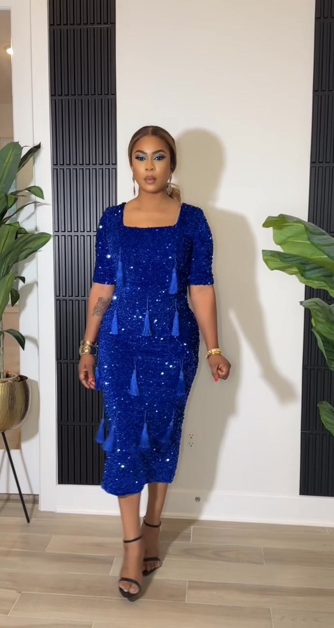 Turn heads in this stunning royal blue midi dress, designed to sparkle with every step. Crafted with all-over sequins, this figure-flattering piece catches the light beautifully, while delicate tassel accents add movement and a touch of playful elegance. The structured square neckline and fitted silhouette create a refined, feminine look that highlights your curves effortlessly.
