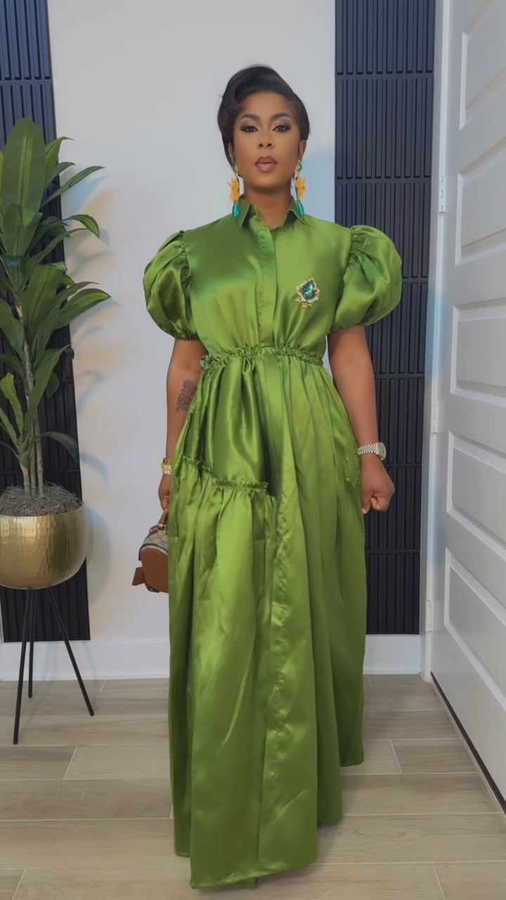 The Jackie a stunning emerald-green satin maxi dress with a polished, elegant sheen. It has short puff sleeves, a collared neckline, and a gathered waistline that accentuates the silhouette while adding a touch of volume to the skirt. The dress also includes subtle tiered detailing for added texture and flow. She accessorizes with statement gold earrings, stacked bracelets, and a structured mini handbag. Her look is completed with a sophisticated updo and soft glam makeup — a perfect blend of modern elegance and timeless style.