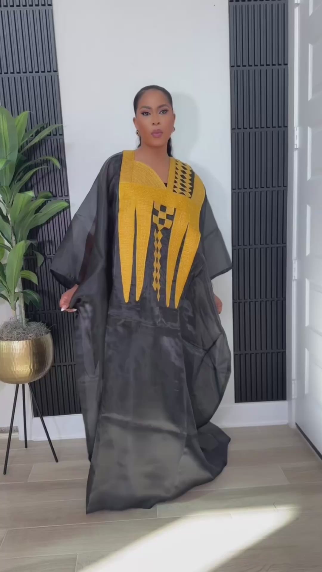 Make a bold yet refined statement in this stunning black kaftan dress, beautifully accented with rich mustard-gold detailing. Designed with a relaxed, flowing silhouette, this piece offers effortless elegance and comfort. The sheer black fabric drapes gracefully, while the intricate geometric embroidery at the front adds a striking cultural touch and visual interest.