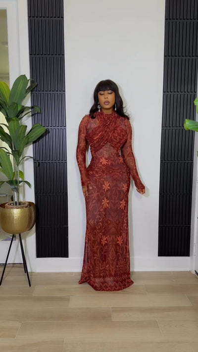 This look features a sheer, long-sleeve maxi dress in rich wine and rust tones, designed with an elegant allover floral and swirl print that adds depth and sophistication. The dress showcases a high neckline with soft draped detailing across the bodice, creating a flattering, sculpted silhouette. Its fitted waist and flowing skirt enhance curves while maintaining a graceful, elongated look. Lightweight and semi-sheer, this piece is perfect for evening events, special occasions, or elevated date nights, offering a bold yet refined statement with effortless elegance.