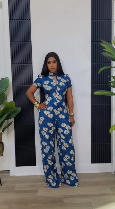 Make a bold yet effortless statement in this chic floral print jumpsuit. Designed in a rich teal base with soft floral accents, this one-piece features a flattering fitted bodice, subtle front keyhole neckline, and short sleeves for a polished finish. The wide-leg silhouette flows beautifully, offering both comfort and elegance, while side pockets add a practical touch you’ll love. Perfect for brunch, events, or an elevated day look, this jumpsuit transitions seamlessly from casual to dressy with the right accessories.