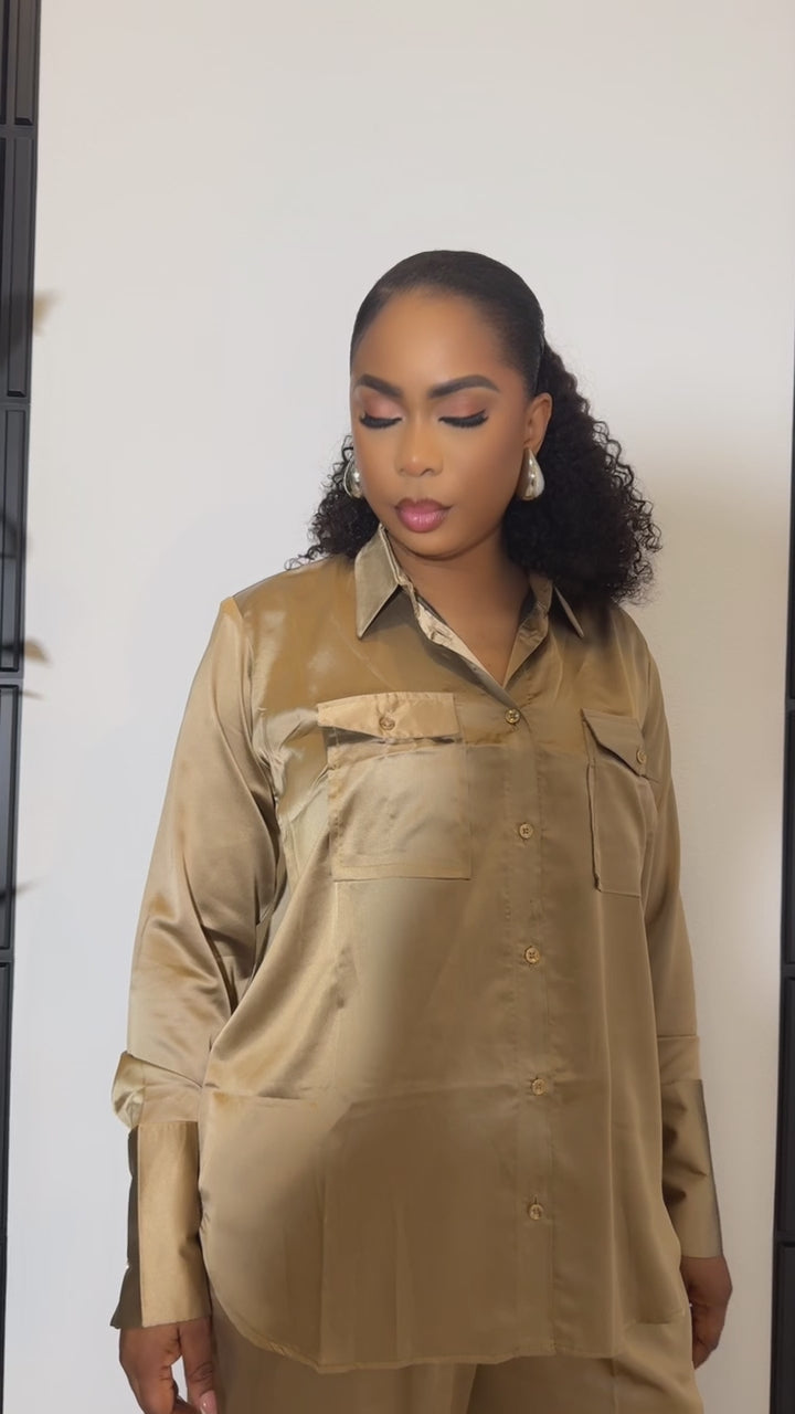 Elevate your wardrobe with this luxe satin two-piece set, designed for effortless sophistication. The ensemble features a long-sleeve button-down shirt with a smooth, glossy finish, complete with dual front flap pockets for a refined touch. Paired with matching wide-leg satin trousers, this set delivers a sleek, streamlined silhouette that moves with elegance. The rich gold tone adds a hint of glamour, making it perfect for evenings out, special events, or upscale casual styling. Soft, comfortable, and undeniably chic — this set brings luxury to everyday wear.