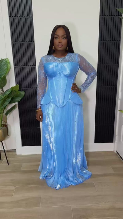 The Reme outfit is a stunning blend of elegance and femininity. The woman is wearing a light Blue gown featuring a structured satin corset bodice with lace long sleeves and a sweetheart neckline. The skirt flows beautifully with pleated details that create movement and dimension, transitioning in soft pink tones. She accessorizes with oversized floral earrings that complement the romantic feel of the dress and carries a chic orange clutch bag for a bold pop of color. Her short, sleek hairstyle and radiant makeup complete the polished, graceful look — perfect for a formal event or special occasion.