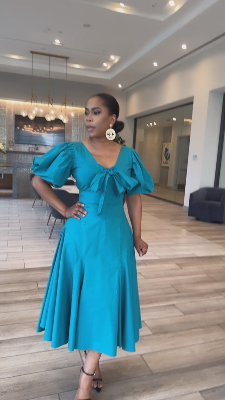 It’s a Bold Elegance Puff-Sleeve Midi Dress,Make a striking statement in this vibrant midi dress, designed to exude confidence and charm. Featuring dramatic puff sleeves and a flattering A-line silhouette, this dress brings timeless femininity with a modern twist.