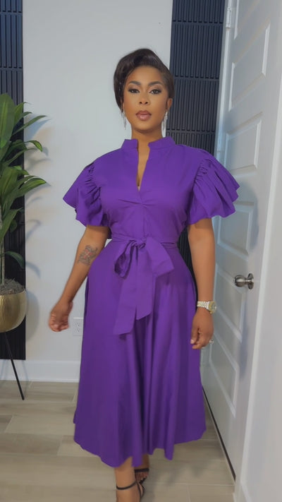 The TETE dress is an elegant midi dress that blends sophistication with charm. The dress features short flare sleeves that add volume and a touch of drama, while the neckline is modest with a small V-slit for a refined, modern look. A matching fabric belt cinches the waist, tying into a bow that enhances the feminine silhouette. The skirt flows gracefully into a soft A-line shape, giving it a classic, flattering drape. She completes the look with burgundy heels adorned with bold bow details, adding a playful yet polished finish to the ensemble.