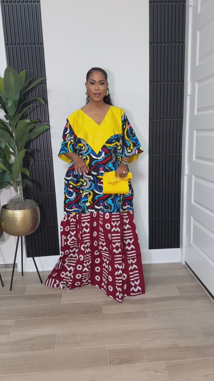 The dress Boubou is a vibrant and elegant multi-colored boubou made from Ankara fabric. It features a loose, flowing silhouette with a V-shaped neckline and short wide sleeves, offering both comfort and style. The design combines bold color blocks and patterns — including green, blue, purple, pink, and black sections with circular and abstract motifs. The top has a black panel with a tasseled tie detail, adding a refined touch. The overall look is completed with statement blue earrings, giving the outfit a polished and sophisticated appearance perfect for special occasions or cultural events.
